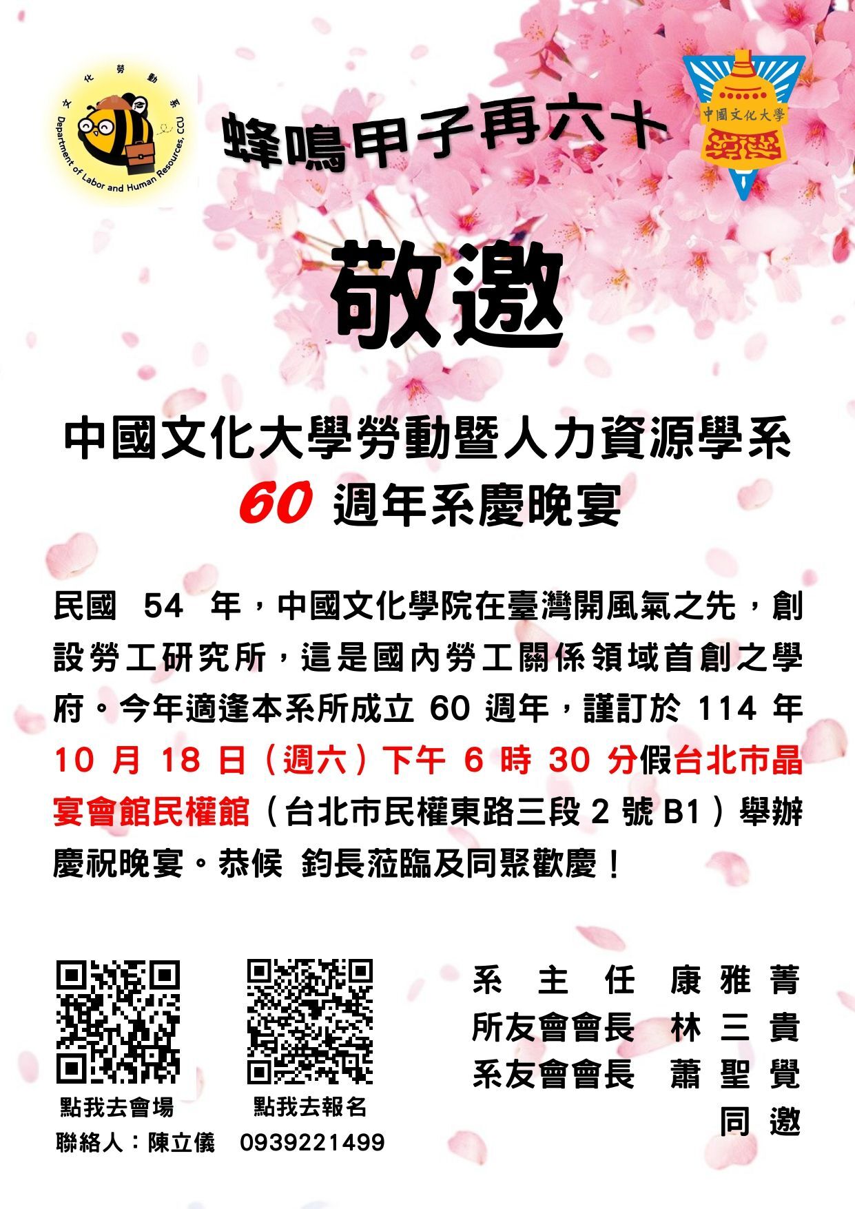 【敬邀】中國文化大學勞動暨人力資源學系所60周年慶祝晚宴