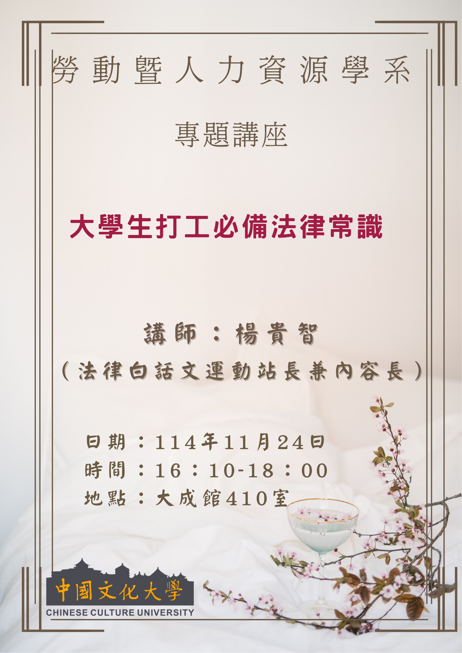 【專題講座】114年11月24日「大學生打工必備法律常識」講師:楊貴智 (法律白話文運動站長兼內容長)