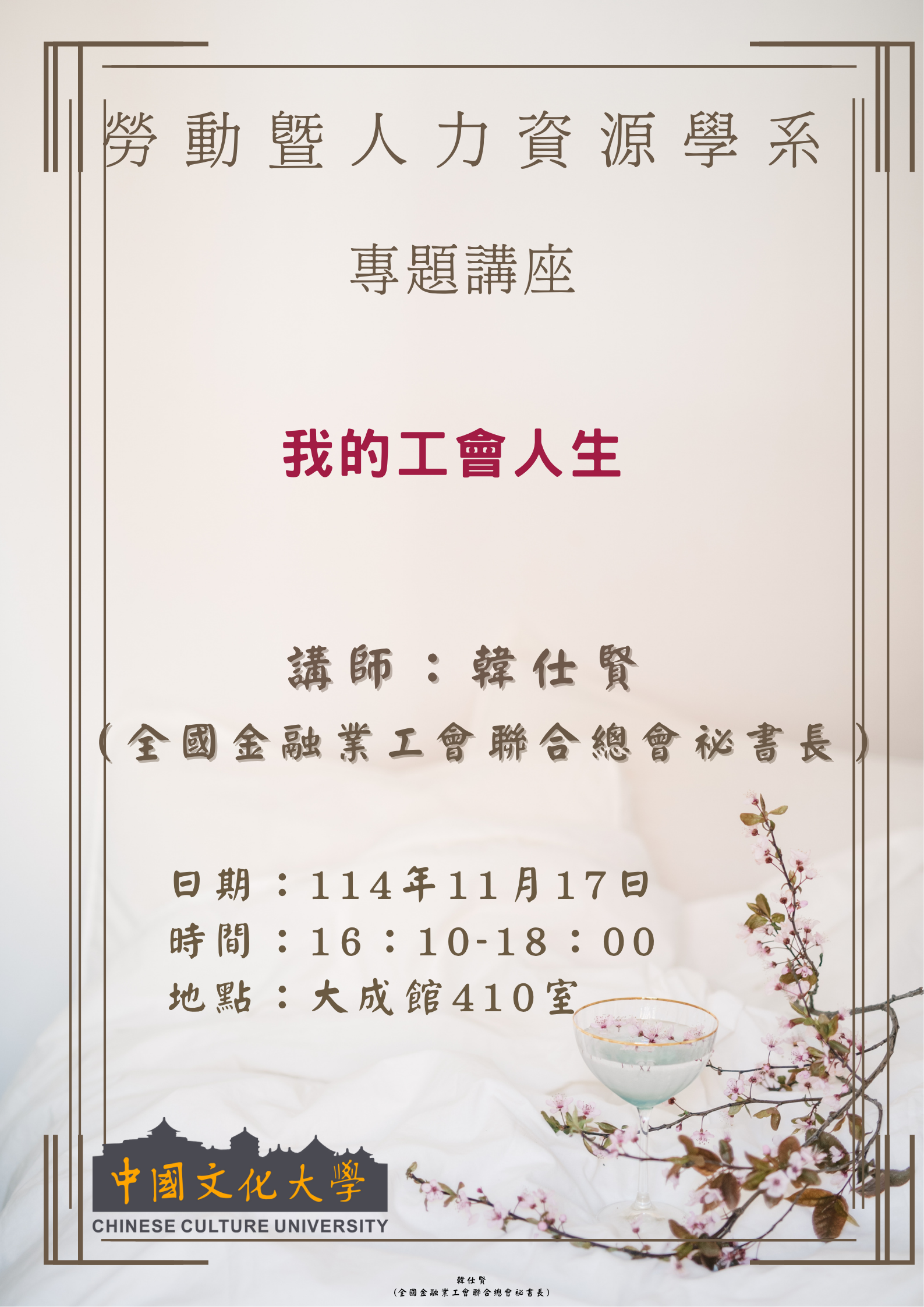 【專題講座】114年11月17日「我的工會人生」講師:韓仕賢 (全國金融業工會聯合總會祕書長)